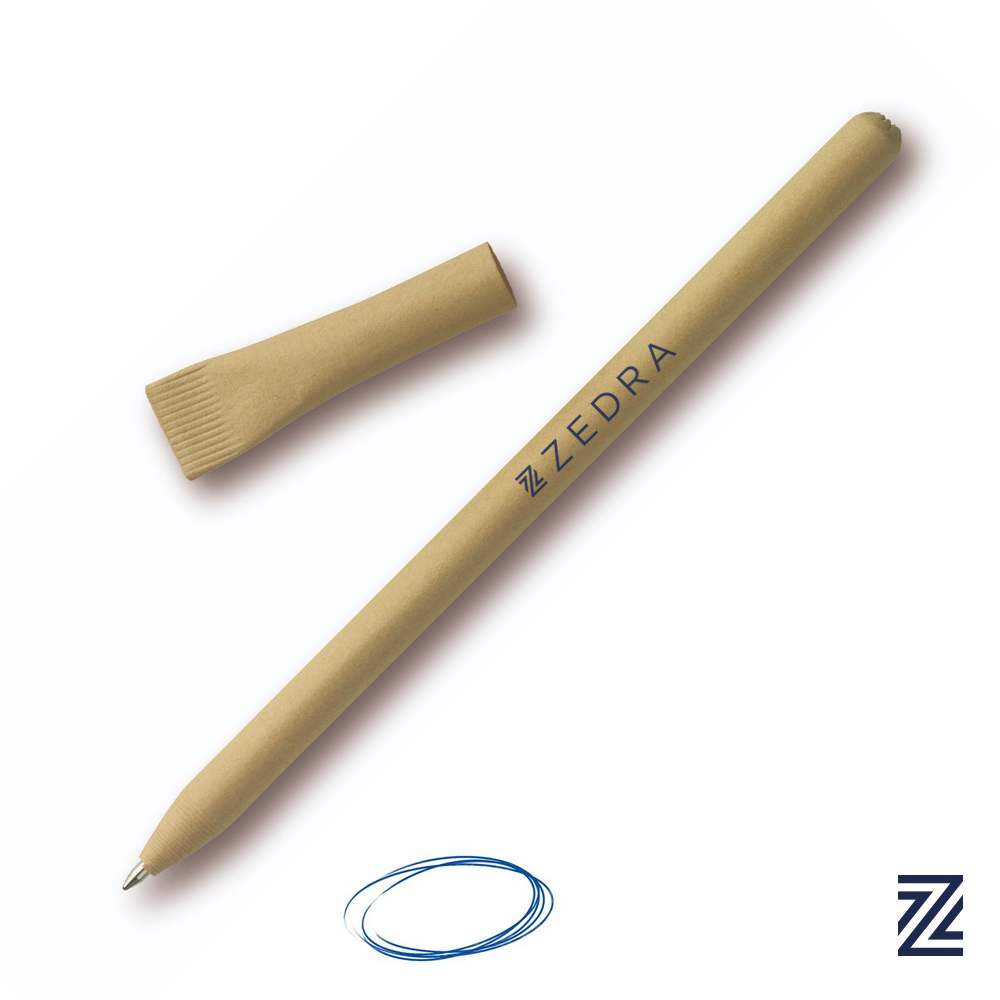 Ball pen with cap entirely made from recycled paper with blue ink.